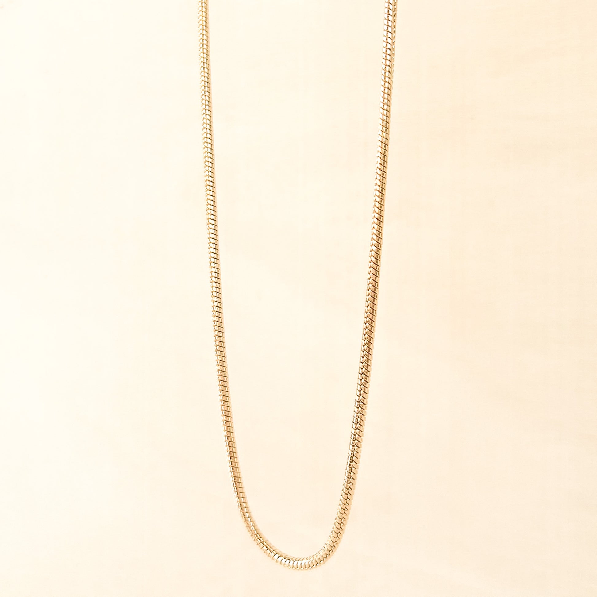 The 2mm Round Snake Chain is delicate and simplistic. Great as a layering chain, or pair with your favourite pendant.