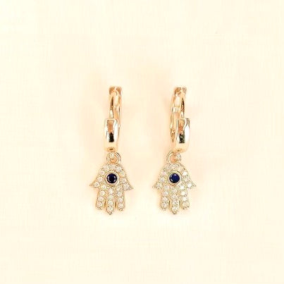 The Hamsa charm is adorned with sparkling cubic zirconia stones, adding a touch of elegance, and features a small dark stone at the center for an extra layer of mystique and allure. These earrings are lightweight, comfortable, and designed with a secure hoop closure, making them ideal for any occasion.