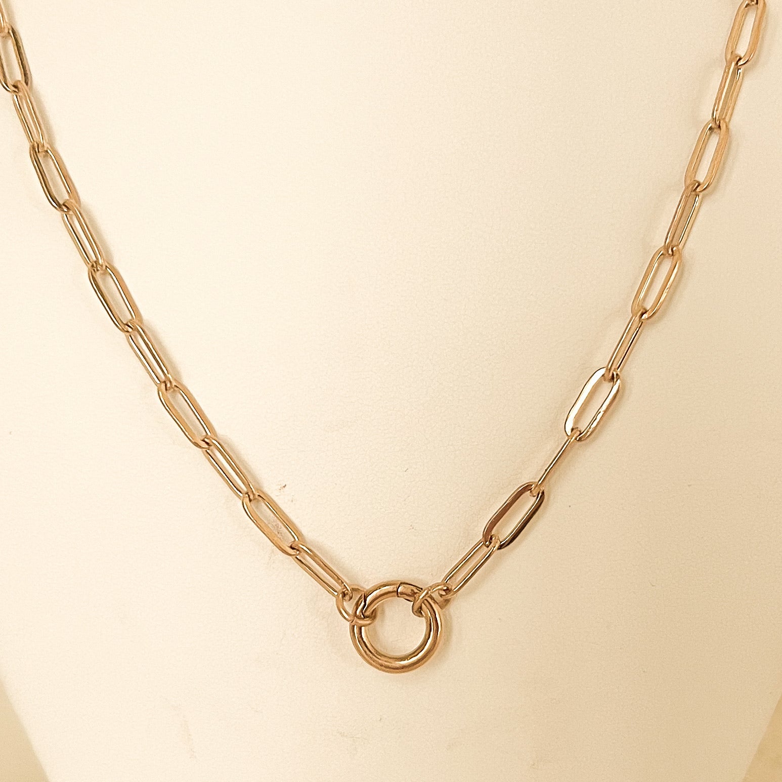 Introducing our 18k Gold Vermeil Paperclip Clasp Chain – a versatile, elegant piece designed for the modern minimalist. This 18" chain features sleek paperclip links that create a refined, elongated look, offering a timeless style that effortlessly elevates any outfit. Made from high-quality 18k gold vermeil, the chain is both durable and luxurious, providing a beautiful luster that lasts. The bold circular clasp at the center not only adds a unique aesthetic touch but also allows for easy attachment of your favorite charms or pendants. Perfect as a standalone statement or layered with other pieces, this chain is the ultimate accessory for any jewelry collection.