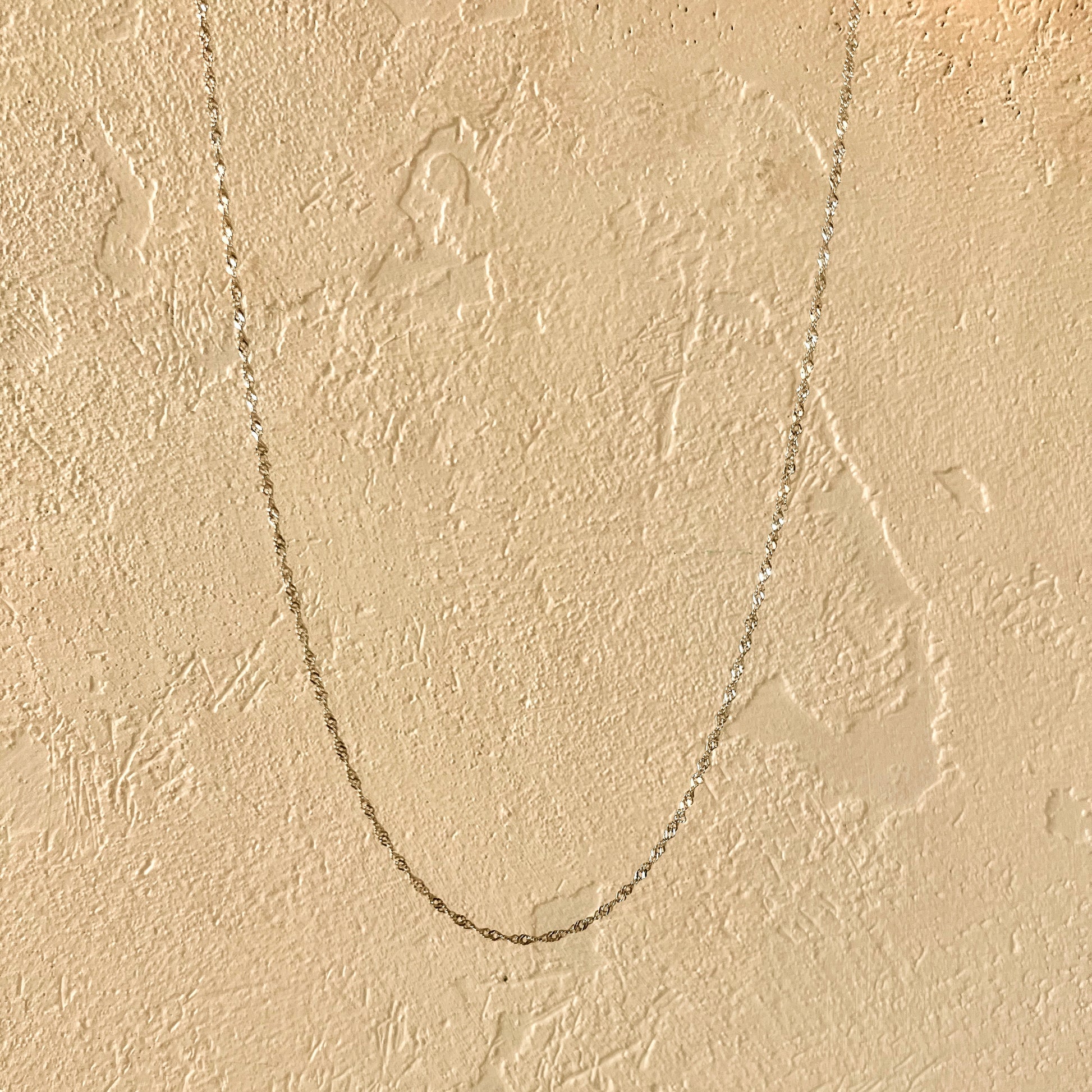 This thin twist chain features closely linked loops that create a smooth, shimmering finish, making it a versatile accessory for any style.